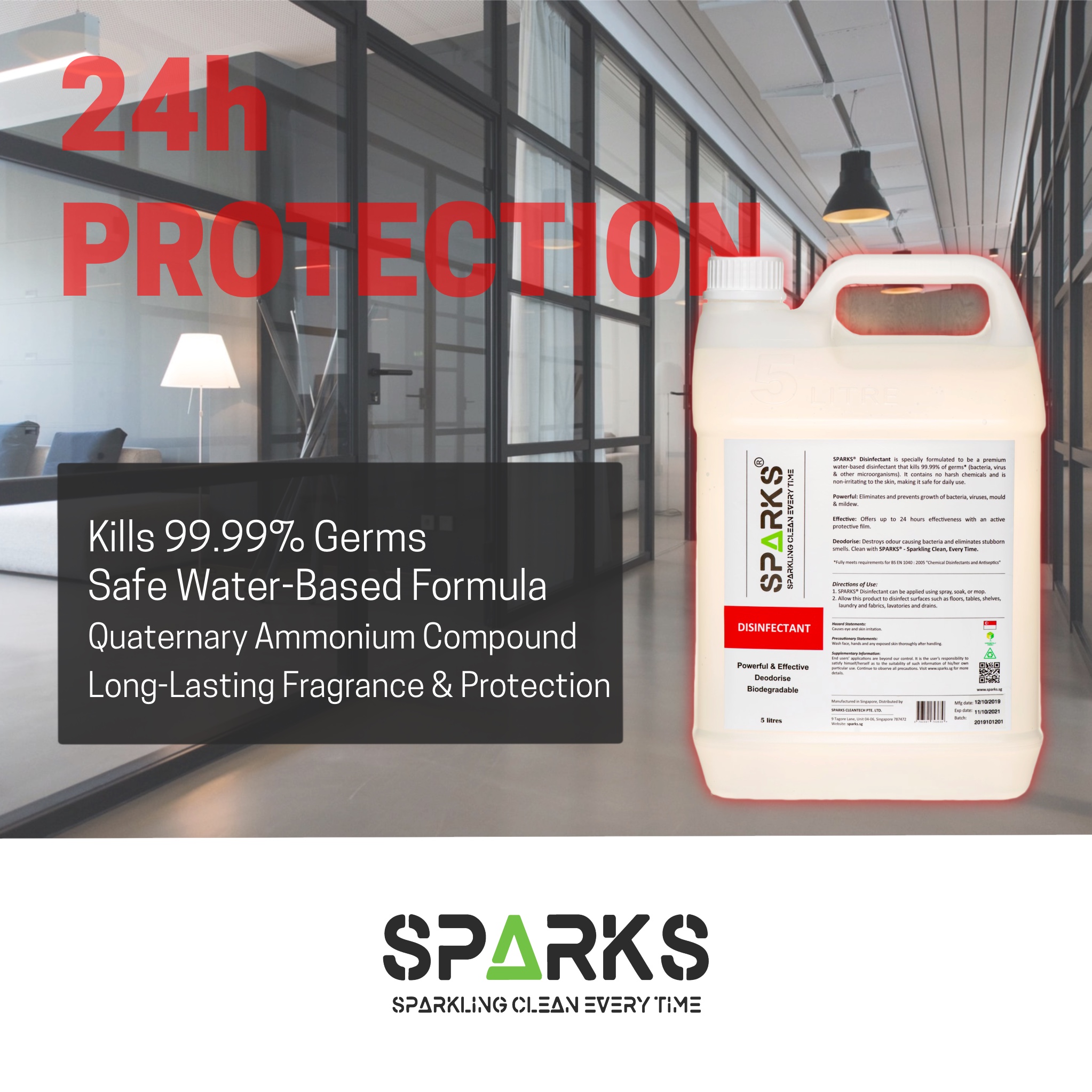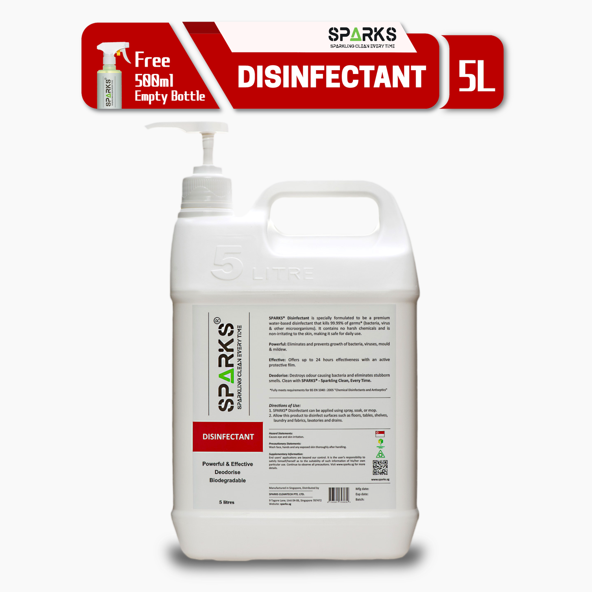 Sparks Disinfectant (5 Litres) with Pump Dispenser Top (inclusive of 500ml plastic spray bottle) - Premium Water Based Sanitiser (Sanitizer) with Multi-Action and Broad Action Kill Against Bacteria, V