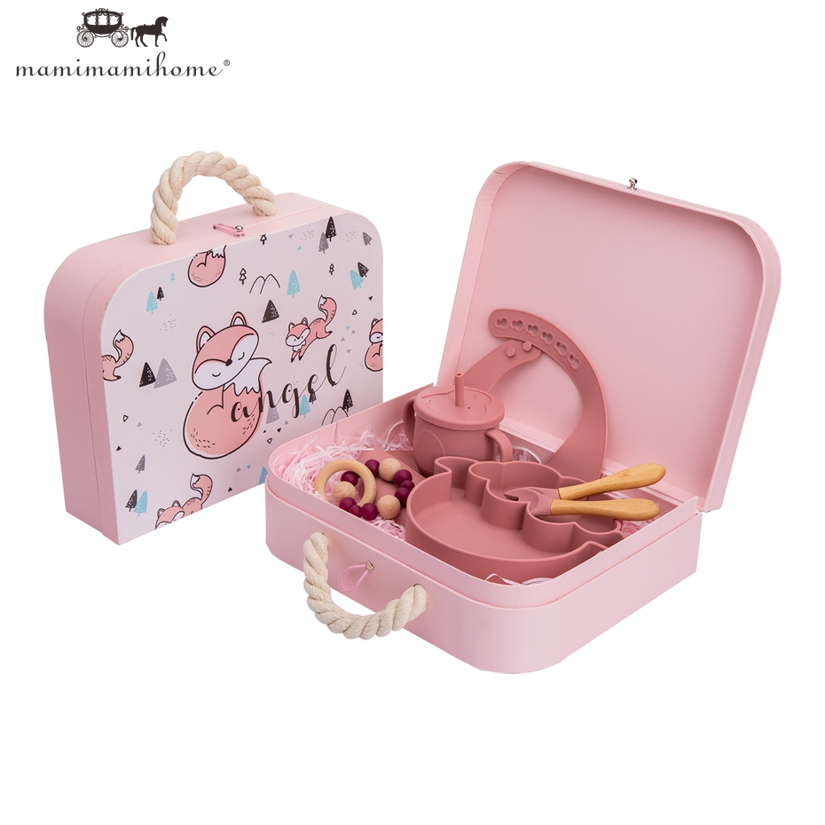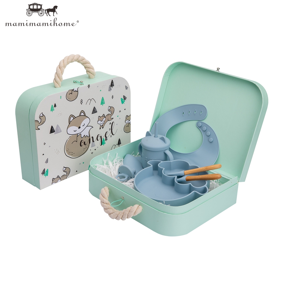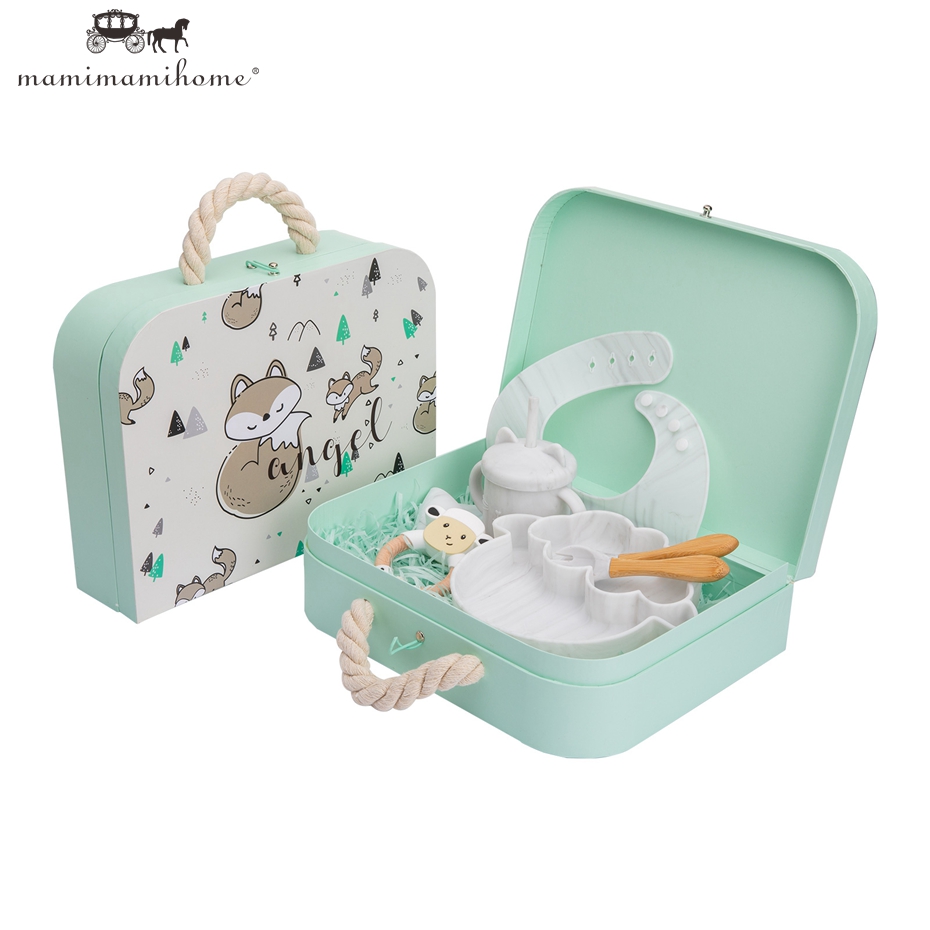 Mamimami Home Baby Feeding Set 6pcs 100% Soft Silicone Bib,Sippy Cup,Suction Plate with Box Best Kids Gift