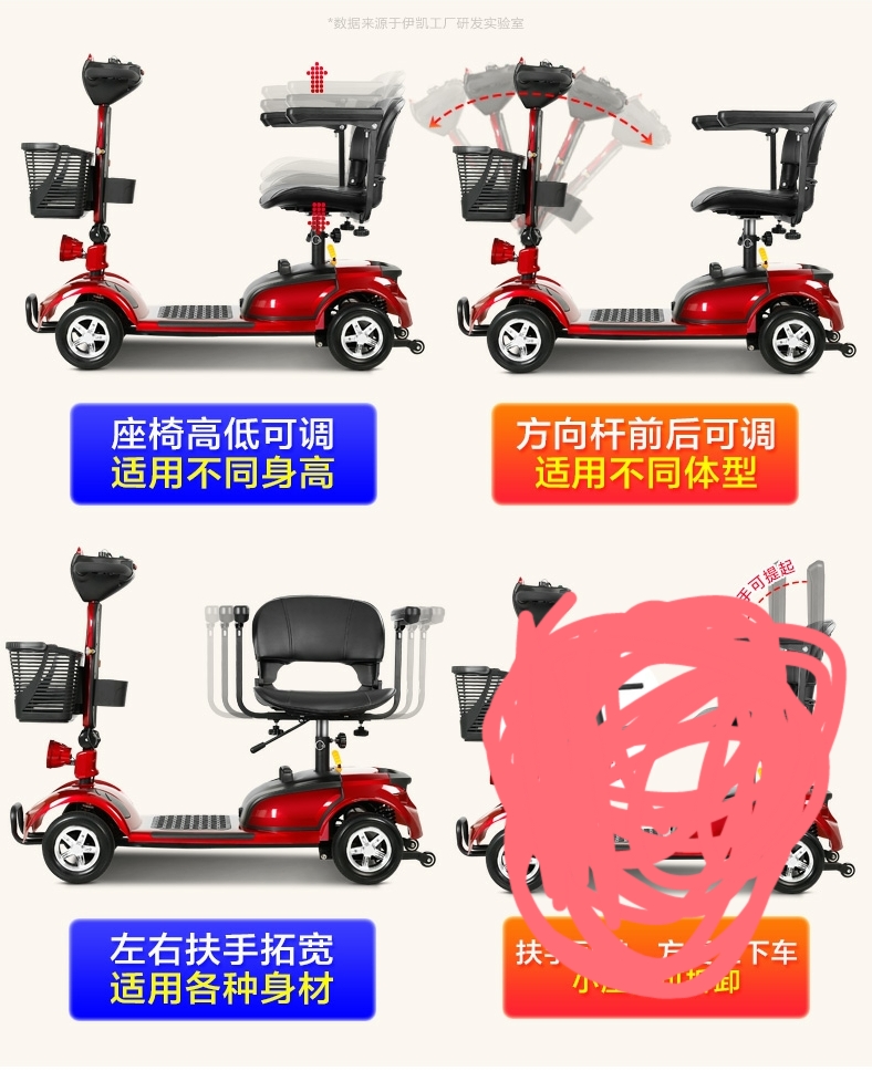 24v 12a lead-acid battery, 250w motor. The seat can be rotated 360 degrees and the armrest can be raised.speed:2-8km/h. maximum load 120kg.