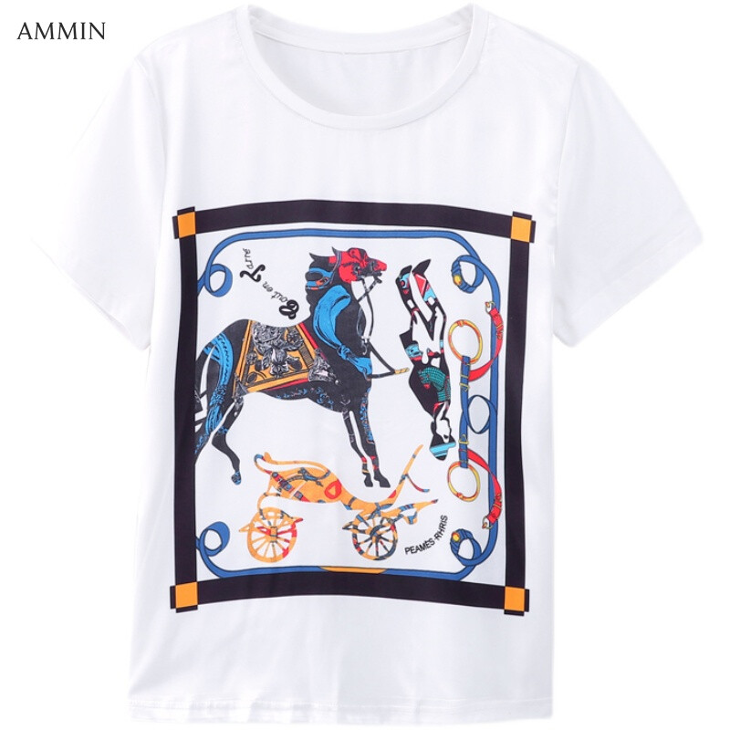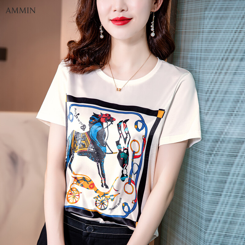 AMMIN 2021 new silk T-shirt women loose short sleeves unique positioning printing white round neck top blouse