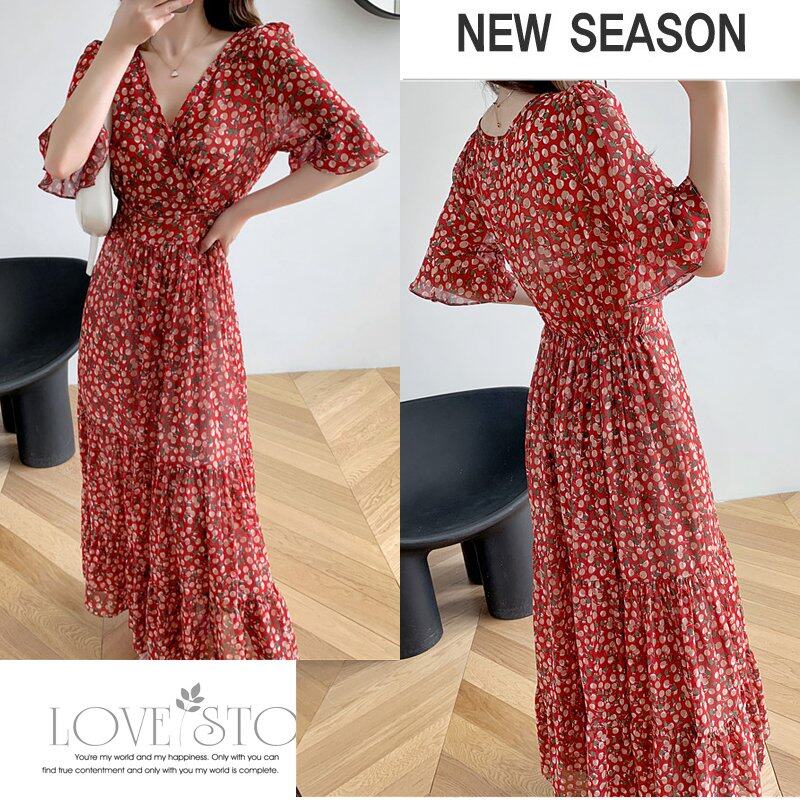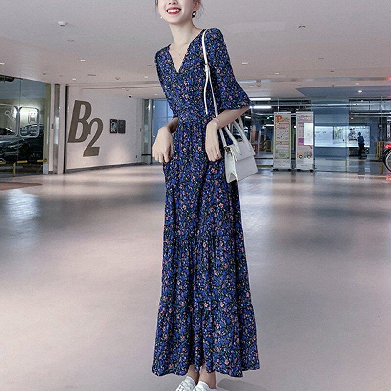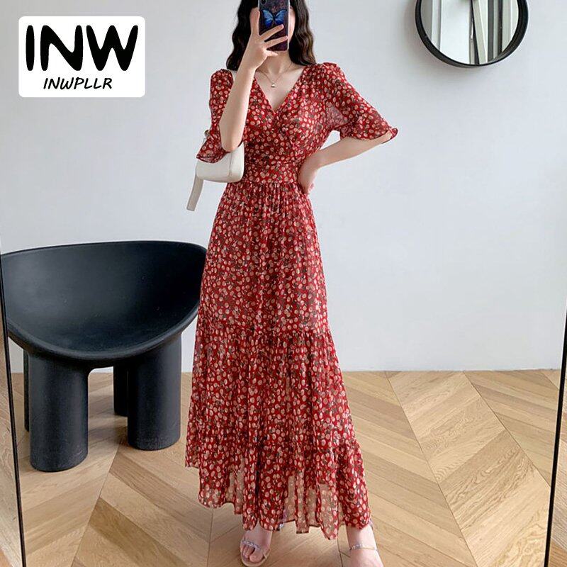 INWPLLR Elegant Fashion Dress Women Puff Sleeve Dress Casual Retro Short Sleeve Floral Printing Dresses Summer Korean Long Dress Female