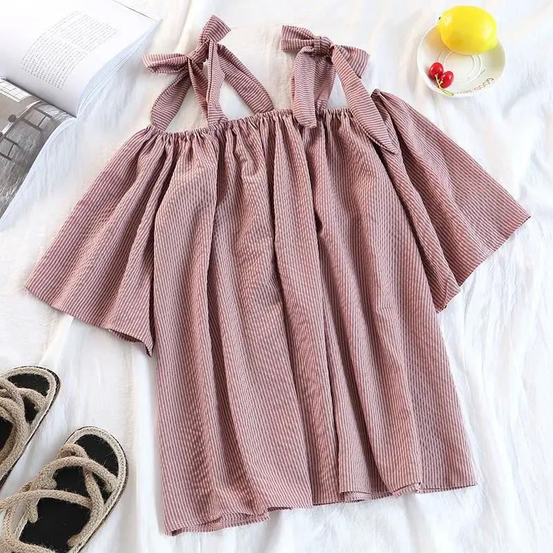 EDQRDQ Womens Summer Off Shoulder Blouse Striped Lace Up Top 3/4 Sleeve Casual Chiffon Tops Shirts