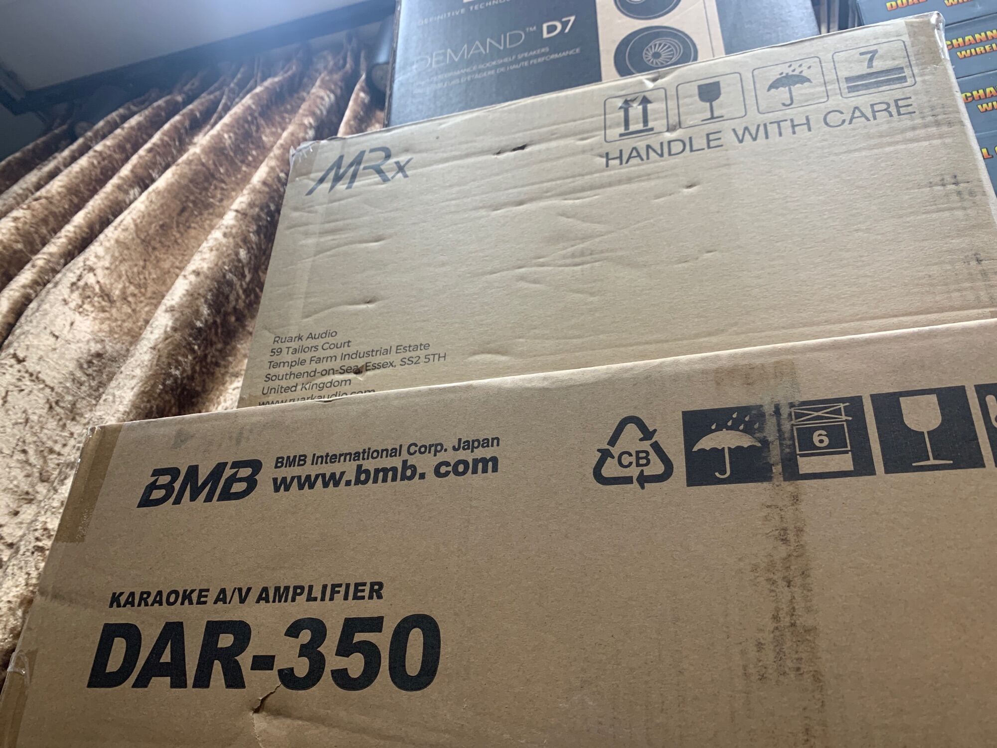 DAR-350 Amplifier Max Output Power 350W x 2CH (8 0hm): 2 speakers nystem Audio Input 4 systems (KARAOKE, AUX, Bluetooth) Mic Input 4 systems : front 2, rear 2 USB Input 1 port (For play music) Audio Output 1 system (RCA)L/R (Can be switched to pro-out / subwoofer Equalizer 5 bands Music, 12 bands Mic, 6 bands Output L/R Echo Delay, Reverb FBE(Anti-Feedback) 5 Lever/OFF LCD Dislay 4.3 Inch TFT Color LCD Ac Input DAR-350H (SE)-100 AC220V - 240V (50/60 Hz) Remote Control (RMR-350) Including in the product Amp Dimensions 42 x 29 x 9cm Packaging Dimensions 56 x 47 x17cm BMB AMP-Packaging Weight 13KG