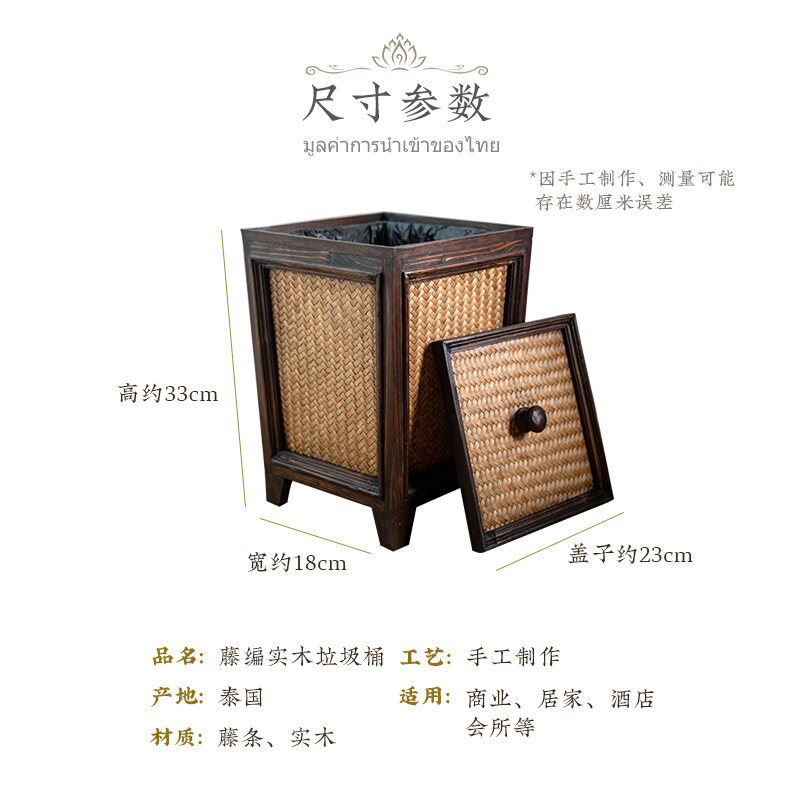 Retro Rattan Wooden Toilet Paper Basket with Lid Living Room Tea Room Kitchen Home Creative Chinese Solid Wood Trash Can