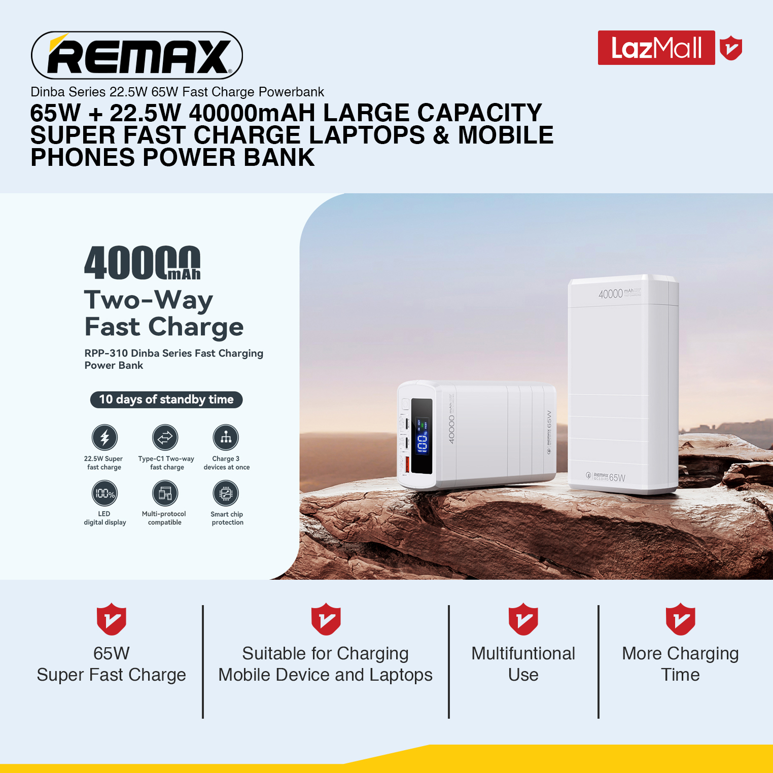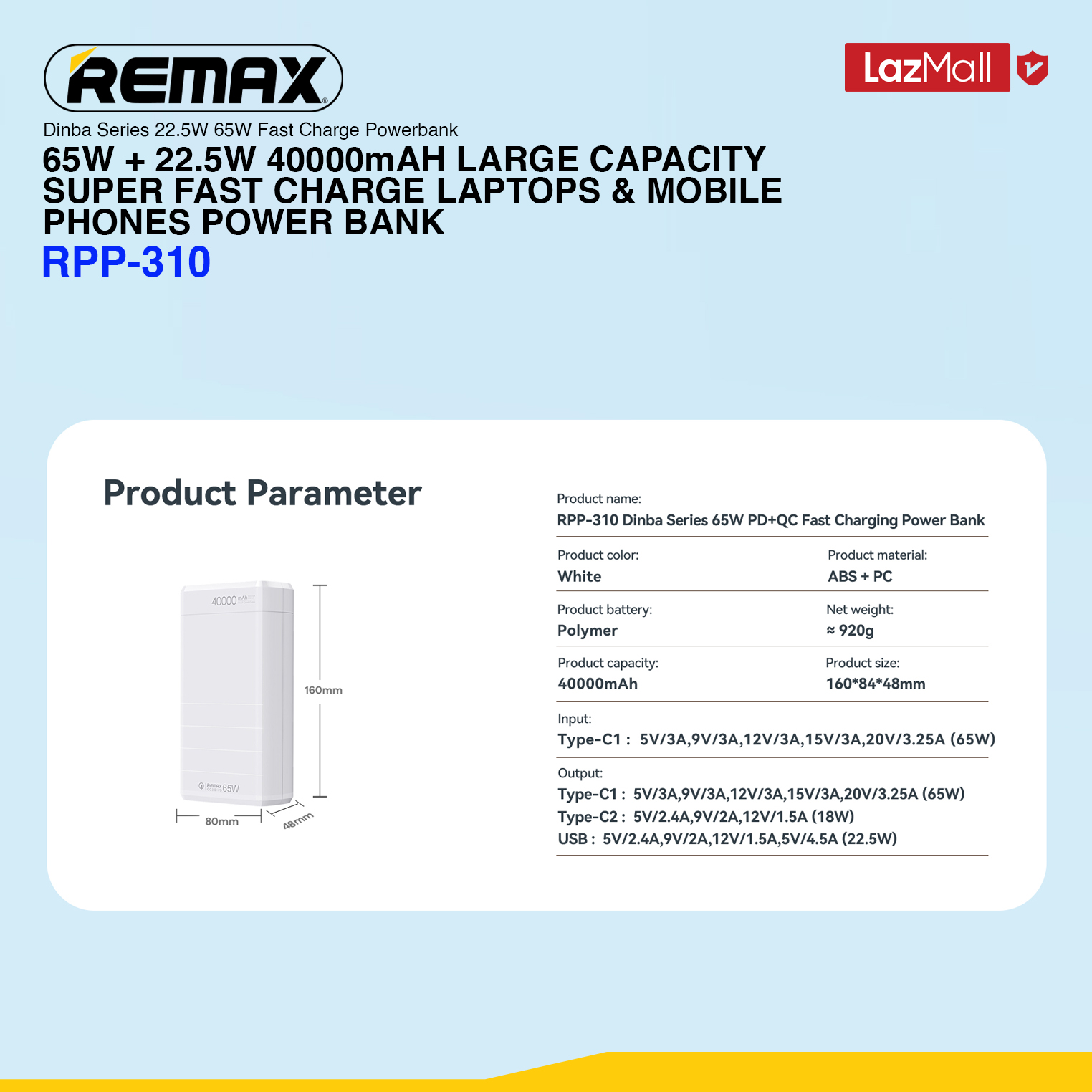 [Remax Energy] RPP-310 Dinba Series 40000mAH 65W + 22.5W Large Capacity Laptop / Mobile Phone Multi Compatible Fast Charging Power Bank