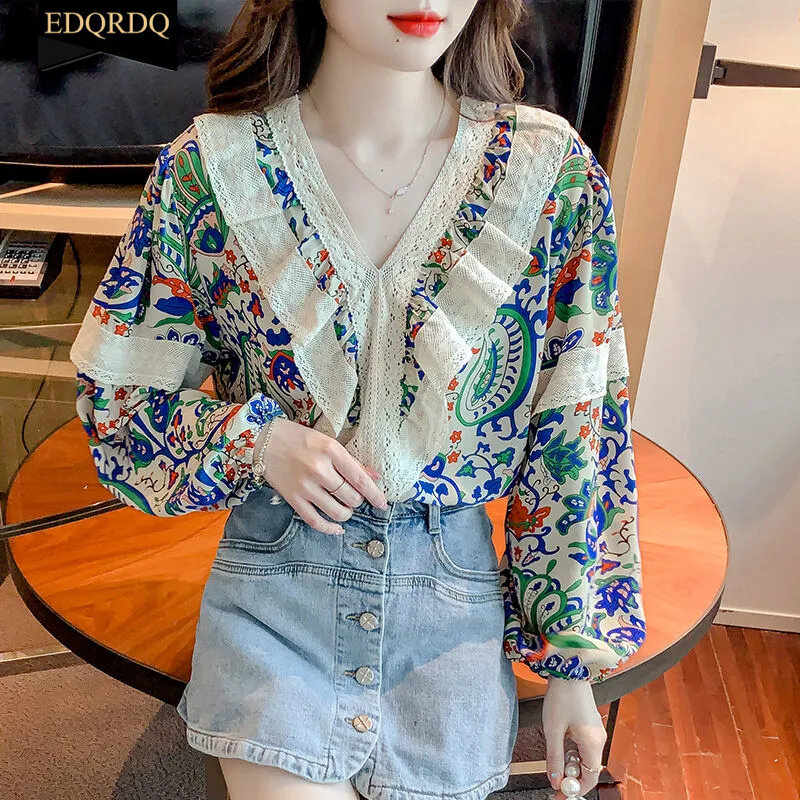 EDQRDQ French Floral Tops Puff Sleeve Lace Shirts Ethnic Blouses for Women