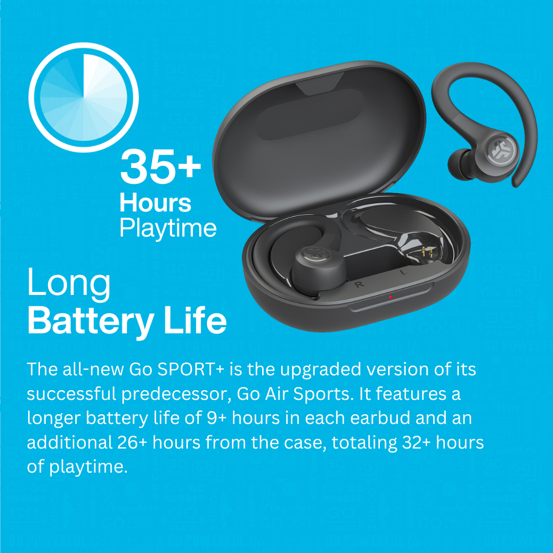 Power through your hardest or easiest workout. With 32+ hours of total playtime and our smallest sport fit ever, the GO Air Sport are mighty (and fun). Auto connect to your device to walk, run, HIIT or talk on-the-GO.