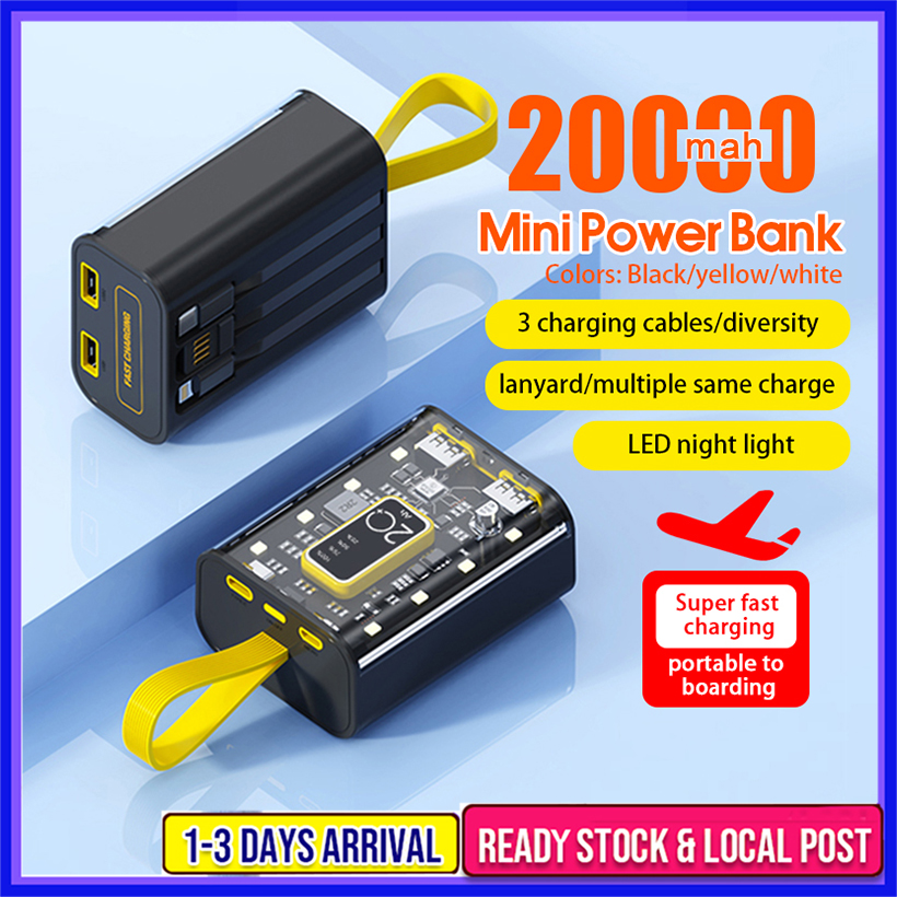 ?SG Ready Stock?20000mah Powerbank Built-in 3 Cables Transparent Cover Fast Charge Power Bank Dual USB Full Capacity Mini Power Bank Mini Power Bank