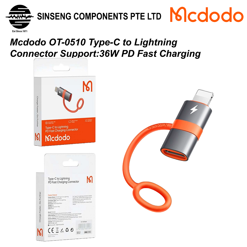 Mcdodo OT-0510 Type-C to Lightning Connector Support:36W PD Fast Charging [Order Model: MCD-OT0510] | OPTION: 7SPD-117PTW / 7SPD-117PTB 20W PD Fast Charger