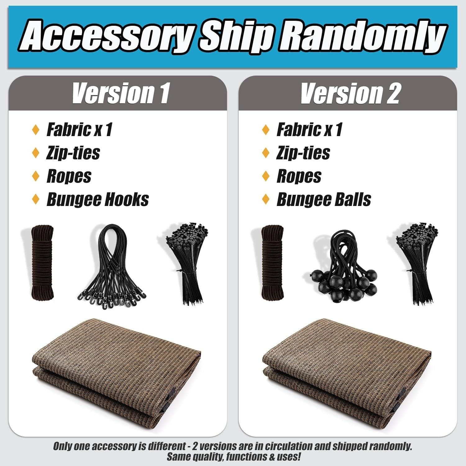 [Accessory Update] Accessories have been upgraded from [zipper, rope, and bungee ball] to [zipper, rope, and bungee hook]. Both versions are currently available and will be shipped randomly. High-Quality Shade Fabric: The pergola shade cloth is made from 200 GSM UV-resistant high-density polyethylene (100% HDPE) with secure seams, tear and abrasion resistance, and up to 90% UV protection.