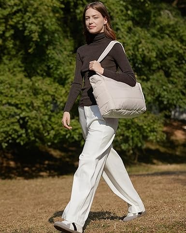 The puffer bag is coming of age: "A puffer bag effortlessly complements any outfit," says Brenda Iris, image consultant, stylist, and founder of Mindful Styling in Minneapolis, Minnesota. Compact Size: Standard dimensions: 16.1" L x 6.1" W x 12.2" H. Ultra-thin: 13.2" L x 5.1" W x 15.7" H. Capacity: 20 liters. This quilted tote is suitable for everyday essentials such as a 15.6" laptop, umbrella, water bottle, power bank, clothes, shoes, and more. The zipper design ensures security.